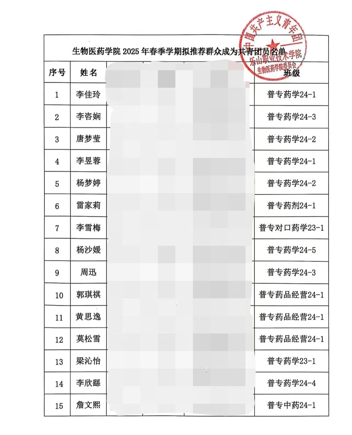 生物医药学院2025年春季学期 拟推荐群众成为共青团员名单公示