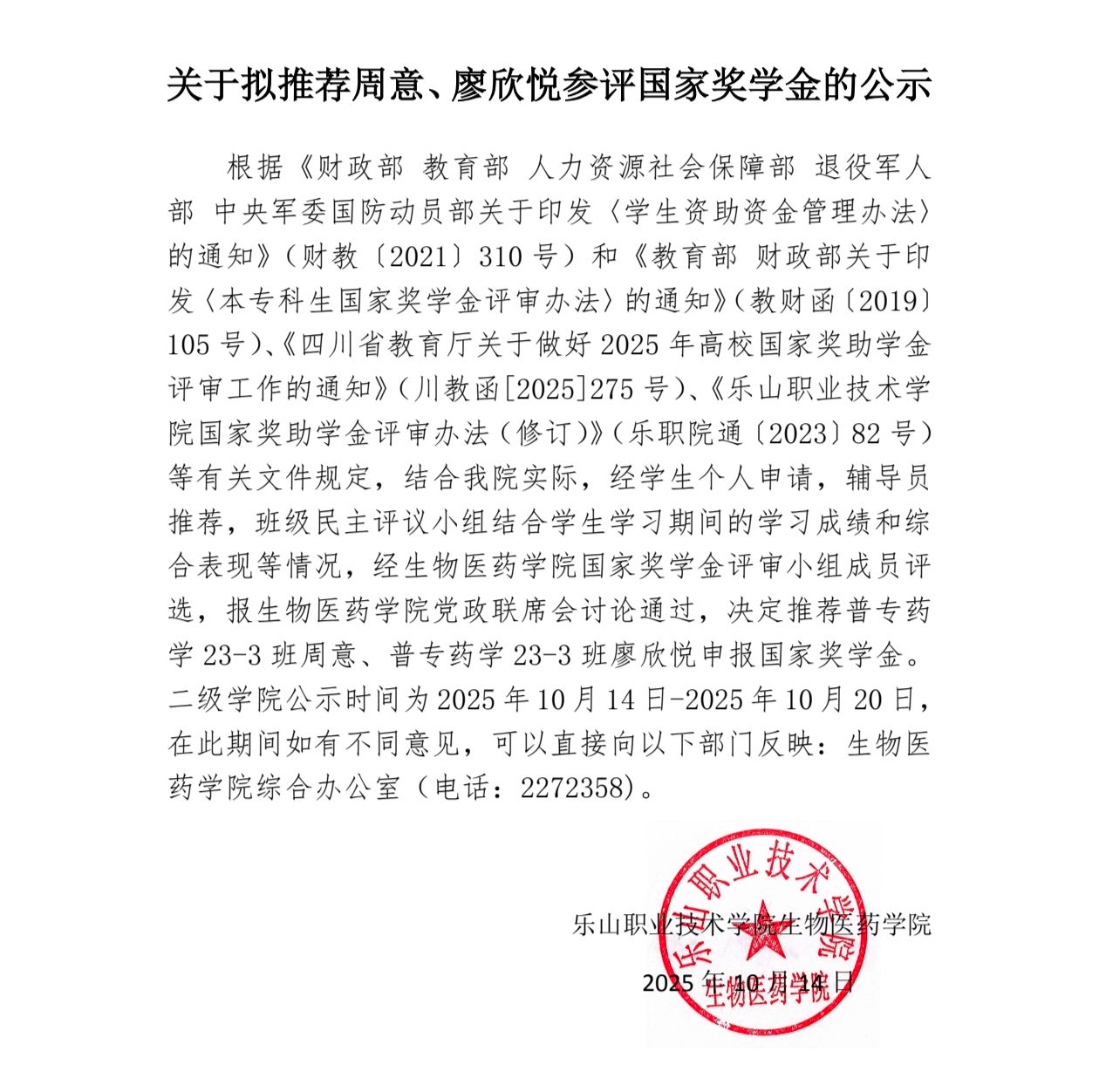 关于拟推荐周意、廖欣悦参评国家奖学金的公示