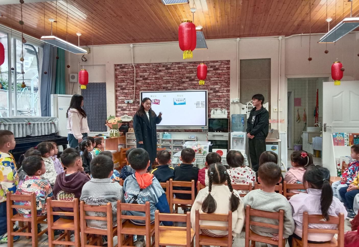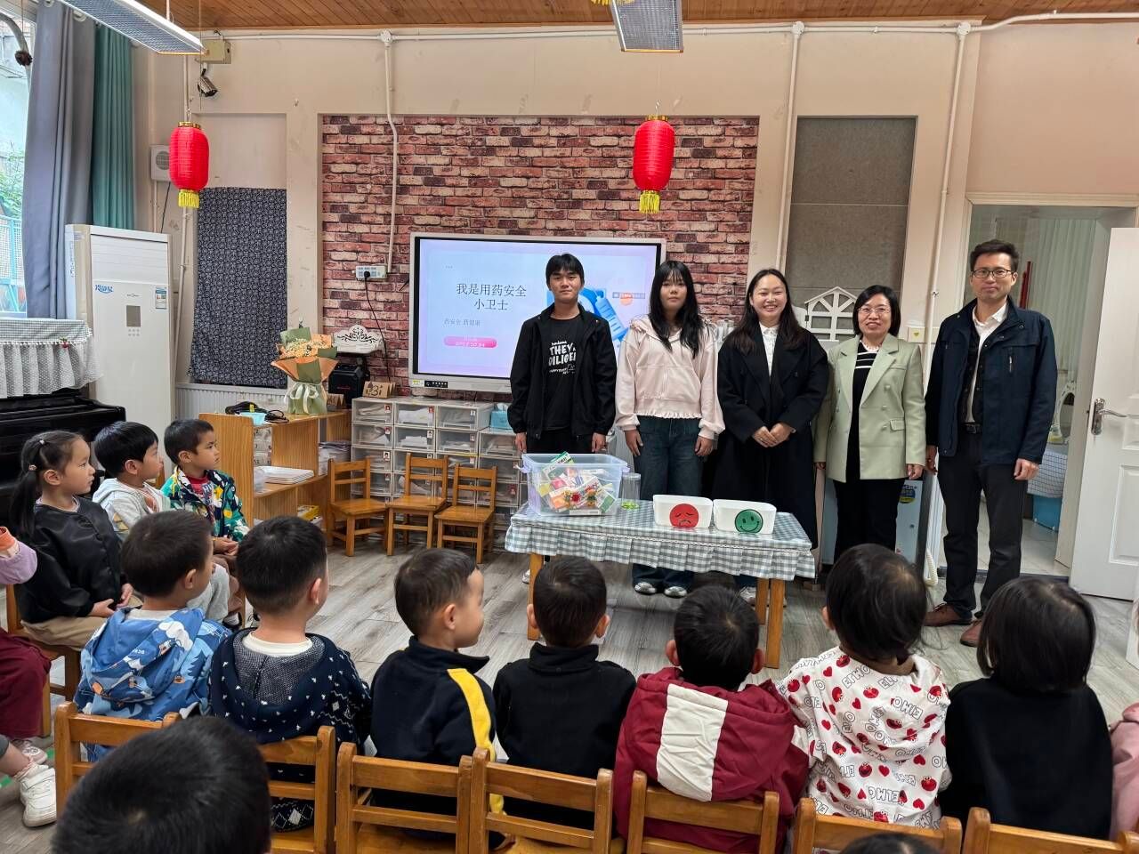 活动以幼儿易懂的“表演小课堂和教学相关知识”相结合的形式展开。首先学生志愿者们表演奇奇哥哥和妙妙姐姐区分药宝宝和糖宝宝的故事,随后老师拿出药盒与糖果盒,让孩子们通过“看外观、闻味道”区分,强调“药非糖,不乱吃;不确定,问大人;家长喂,才能吃”的安全小常识。